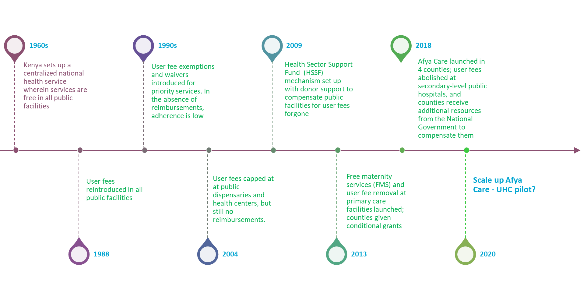 Before the pandemic broke, the National Government was poised to scale up the Afya Care universal health coverage (UHC) program, which it initiated in 4 counties in 2019. Under the pilot program, the 4 county governments agreed to discontinue all user charges at public sector hospitals. In its place, they received additional resources from the National Government in the form of medicines and non-pharmaceutical supplies as well as funds to cover the operating costs of public hospitals, invest in additional health infrastructure and health workers, and finance community health services. This program is an extension of a 2013 government policy that removed all user charges at primary care facilities and started reimbursing them for it (see figure that summarizes the history of user fee policies in Kenya).