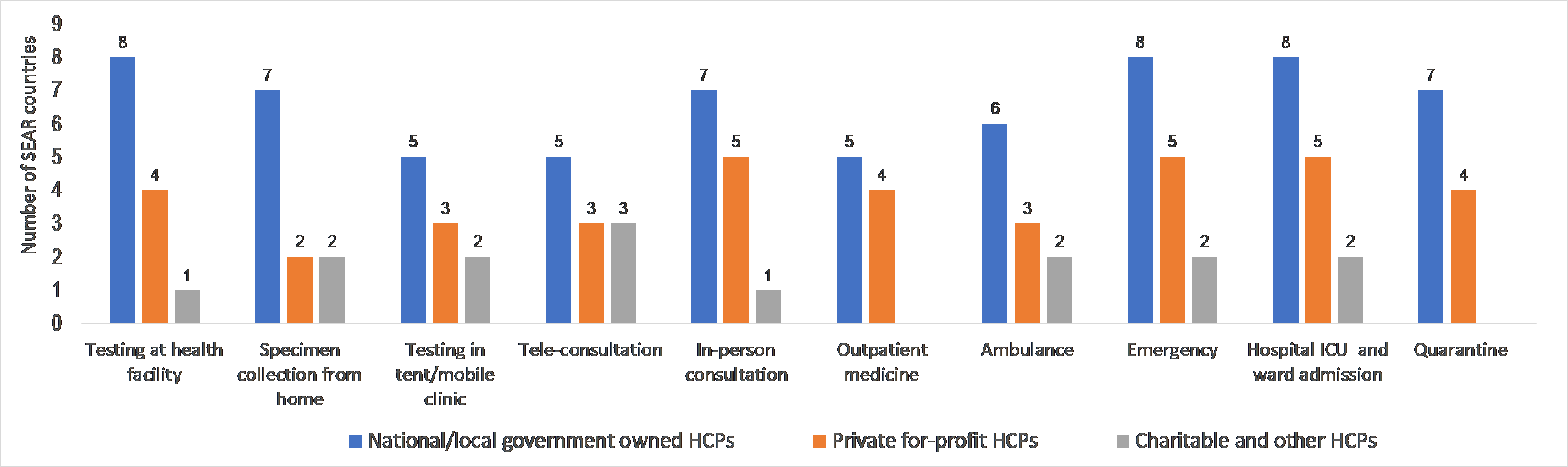 By the mid of June 2020, most countries in the region have not yet experienced community transmission of COVID-19. [11] Nonetheless, in eight countries the private-for-profit providers have already been contributing practically to all COVID-19 health services to a varying degree, such as testing (in health facilities including laboratories), in-person consultations, dispensing of out-patient medicines, emergency room interventions, ICU care, hospital ward admissions and quarantine and self-isolation measures (Graph 1). The contribution by the charitable and other not-for-profit actors across the different services surveyed was found to be less prevalent owing to their size.