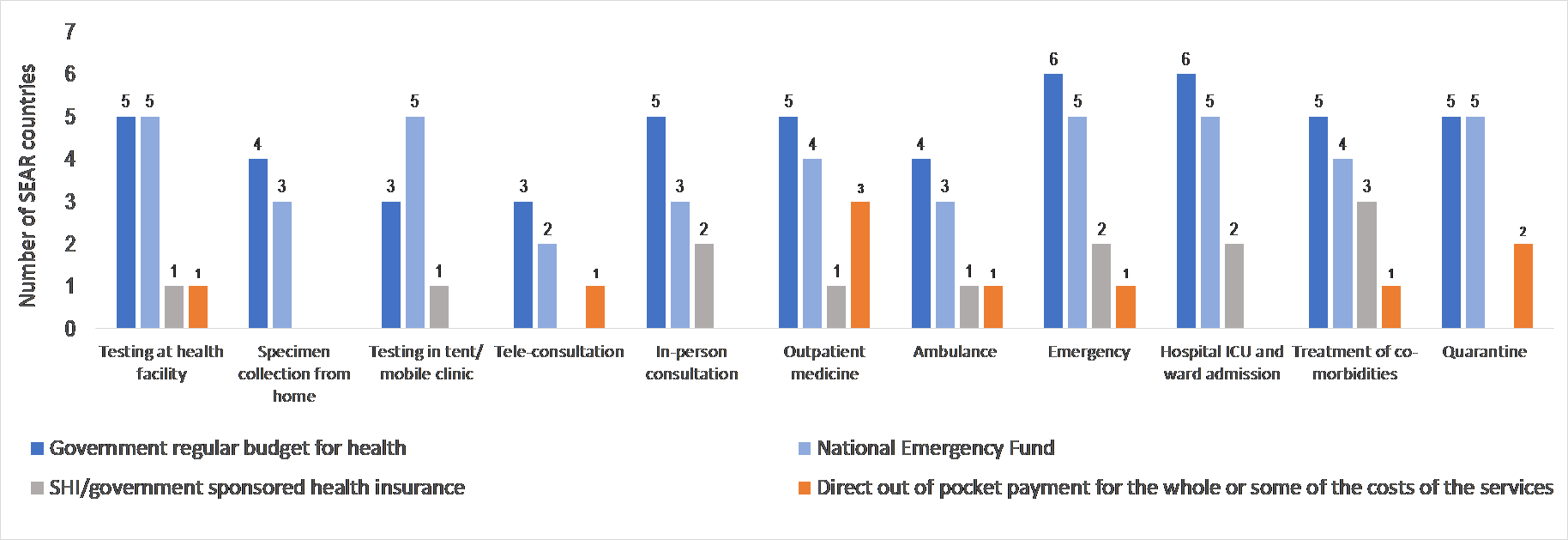 According to respondents, COVID-19 services have been largely funded by government budgets (both regular and for emergency purposes) and also resources from public health insurance programmes such as the Universal Coverage Scheme (UCS) in Thailand and PMJAY in India (Graph 2). In Timor-Leste, an extraordinary transfer was made from the Petroleum Fund (a national wealth fund used for emergency purposes) to the state budget to finance COVID-19 health services.