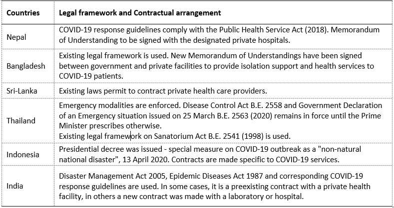 As per the survey responses received, most governments in the region have applied existing legal frameworks to engage private providers in the COVID-19 response (Table 1). A few countries initiated emergency modalities to mobilize additional capacity, e.g. through contractual arrangements with private health care providers during the defined period of the COVID-19 outbreak, like Indonesia and Thailand.