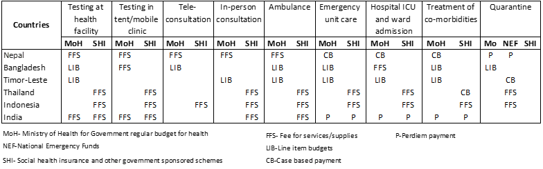 In India, the PMJAY and other public insurance schemes pay for enrolled members, whereas the government budgets cover the non-insured patients in public facilities. In Indonesia, a national emergency stimulus package to tackle the COVID-19 outbreak had been earmarked for healthcare spending, since the health insurance legislation excludes healthcare services from BPJS’s funds during emergencies or extraordinary circumstances. The Thai Public Health Ministry declared that all hospitals, public and private, must do their best to treat COVID-19 patients without delay and no hospital is allowed to charge user fees to patients but bill instead public health insurance schemes, retrospectively. Moreover, the service costs of foreign nationals without private insurance coverage have been decided to be paid by the government contingency fund.